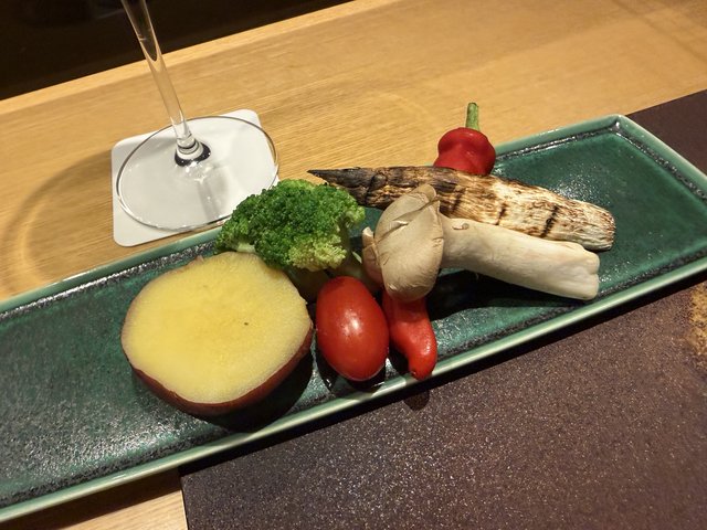 メインの提供時間に合わせて、炭火でじっくりと火を入れていきます。鉄板ではなく炭火ならではの香ばしさと、表面のパリッとした焼き目がたまりません。