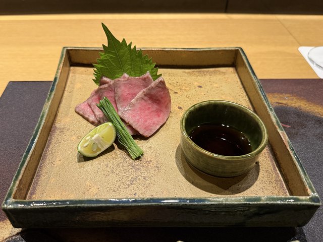 お肉はレアの状態でサーブされ、本わさび、ゲランドの塩、粒マスタードの3種の薬味が添えられます。