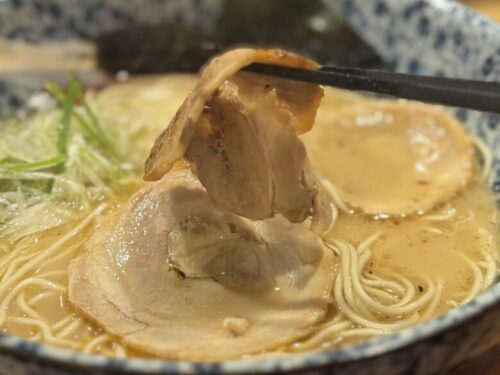 そして麺を頬張る時にはしっかりと豚の風味。一度でニ度の風味が感じられて、一言目が「美味しい」と通りこして「幸せ」と出てしまいます。豚足のコラーゲンもたっぷりだそうです。