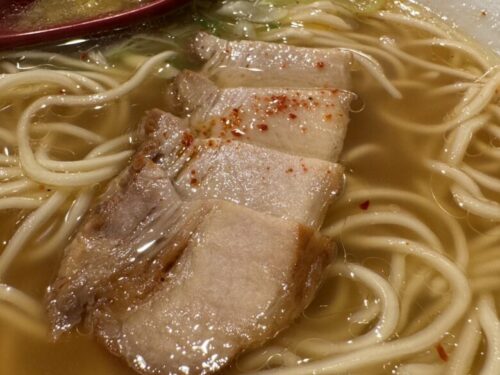 きらきらと澄んだスープに、こだわりのチャーシュー。「麺処てしお」ではラーメンによって、全種類違うチャーシューが出されます。こちらのチャーシューは、肉厚だけれどもほわりと口の中でお肉がほどける魔法がかかっておりました。