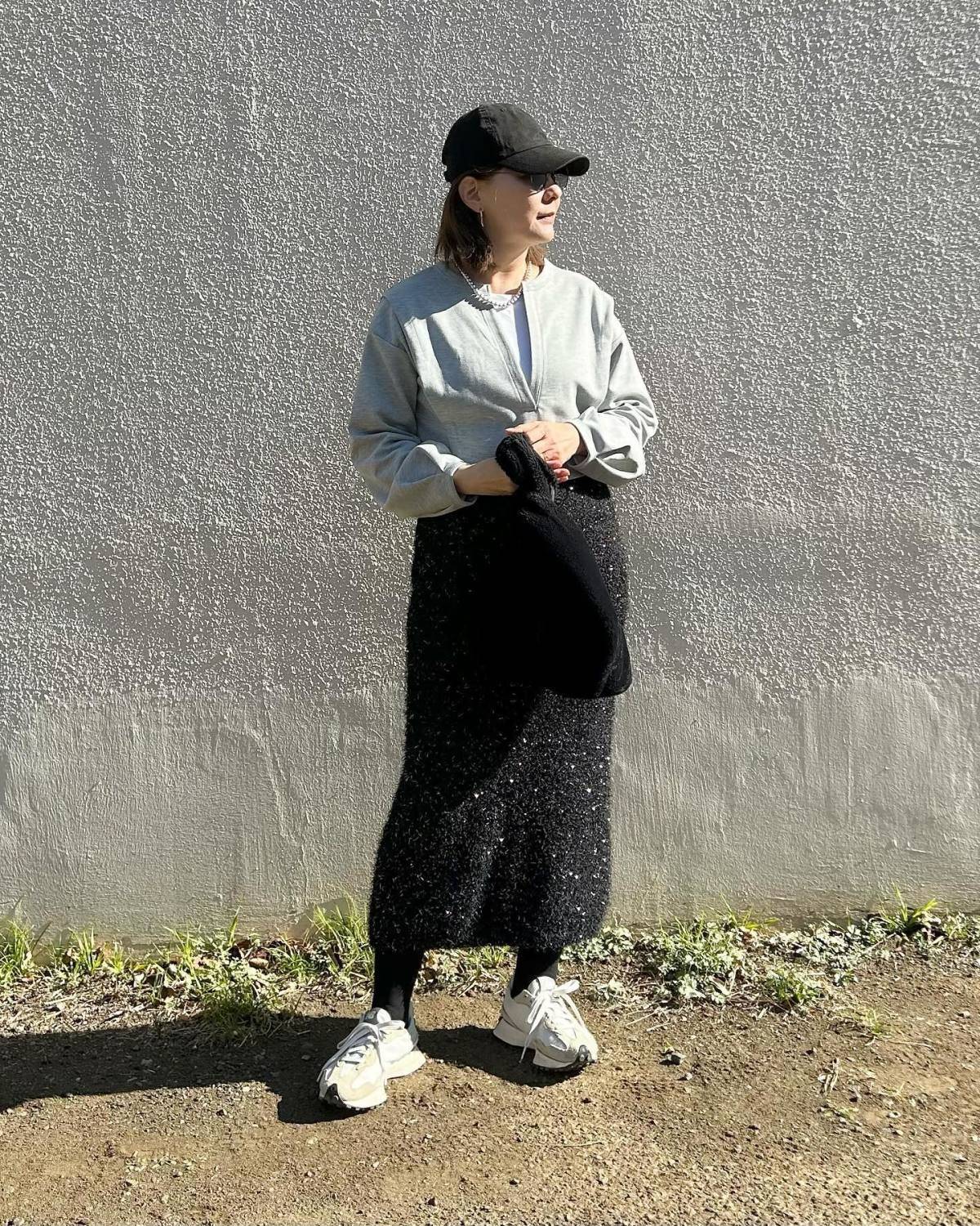 グレーのスウェット×黒スカートは、ベーシックで毎年11月に着たくなりますよね♪