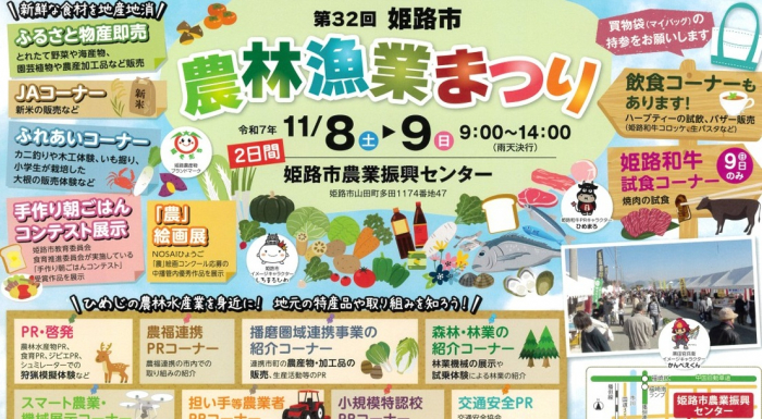 姫路市農業振興センター(同市山田町の)で11月8日・9日の2日間、「第32回姫路市農林漁業まつり」が開催されます。入場無料、雨天決行。