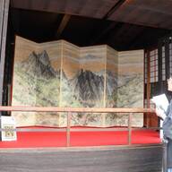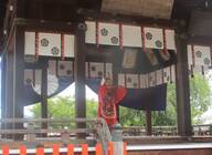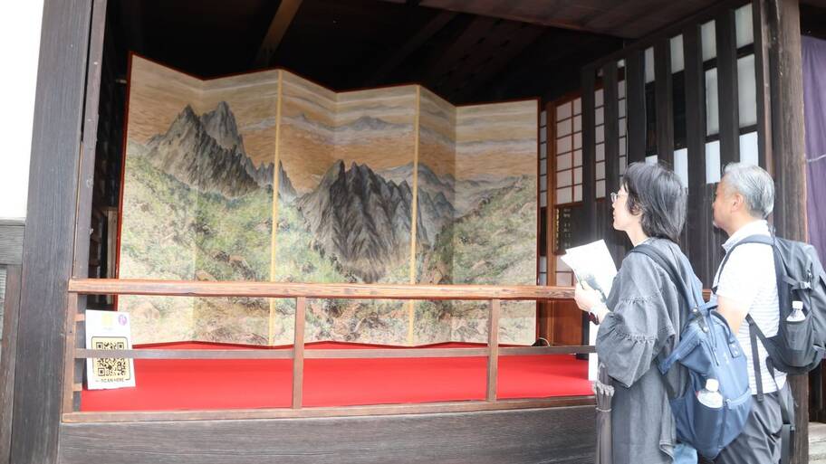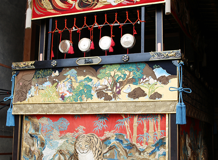 水引幕が復元修理された上野福居町のだんじり「三明」は、展示中に幕の絵をカメラに収める人たちの姿があった。