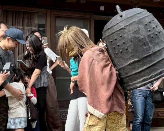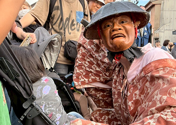 釣り鐘やおのを背負った「ひょろつき鬼」は、通りで子どもを見つけては顔を近づけ、子どもが怖がって親にしがみついて大泣きするおなじみの光景もみられた。
