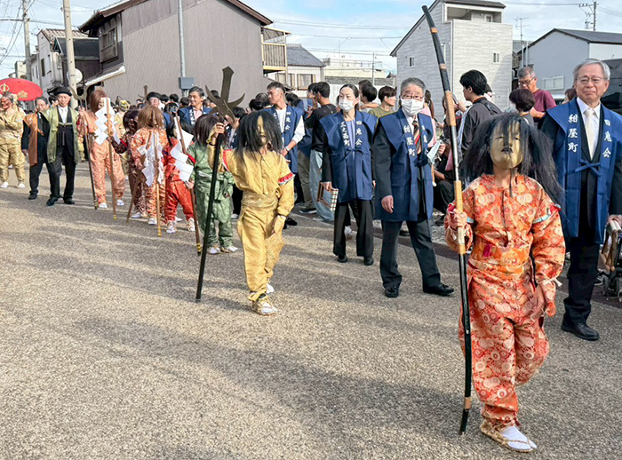 鬼行列は、大御幣を先頭に、鬼町と呼ばれる地元4町の住民らが面をかぶって鬼に扮し、三之町筋を練り歩いた。【YOU公式インスタグラムリール動画「大御幣」(https://www.instagram.com/reel/DP9EQUeiUc5/?igsh=Z2N1dzlrMjNuNHlx)】