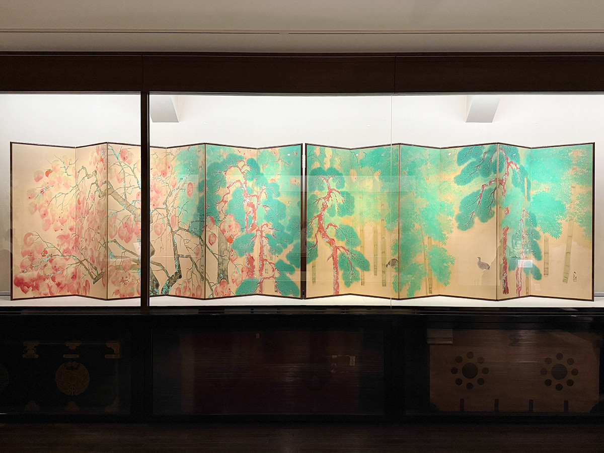 横山大観《柿紅葉》は、再興第7回院展に出品された作品。幹にたらし込みを用いるなど琳派への傾倒も感じられ、当時の大観が追求した彩色画の特徴がよくあらわれています。