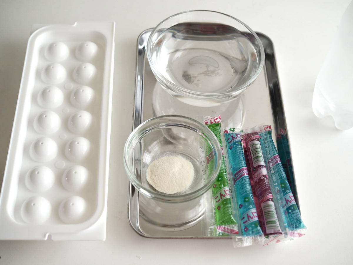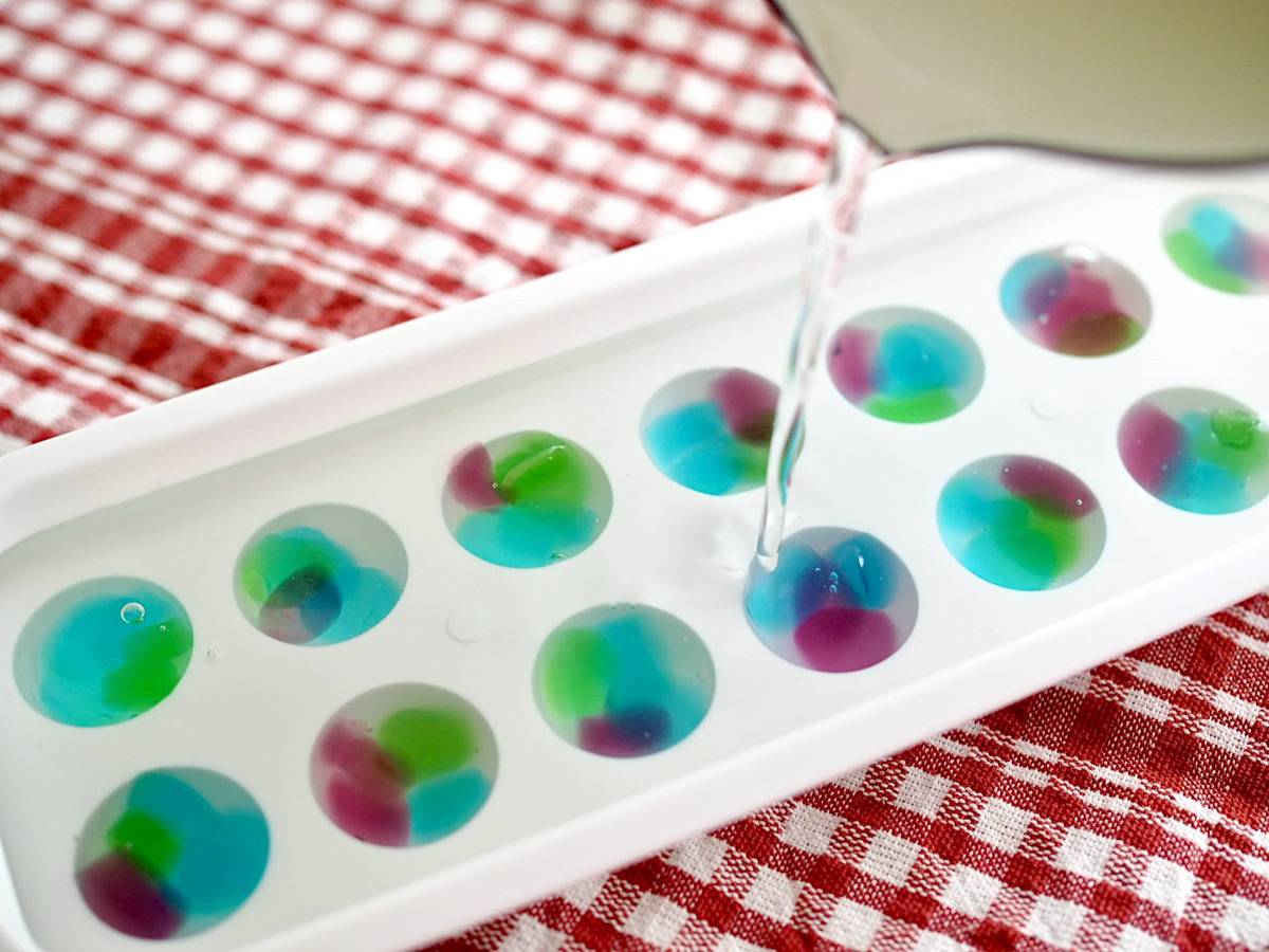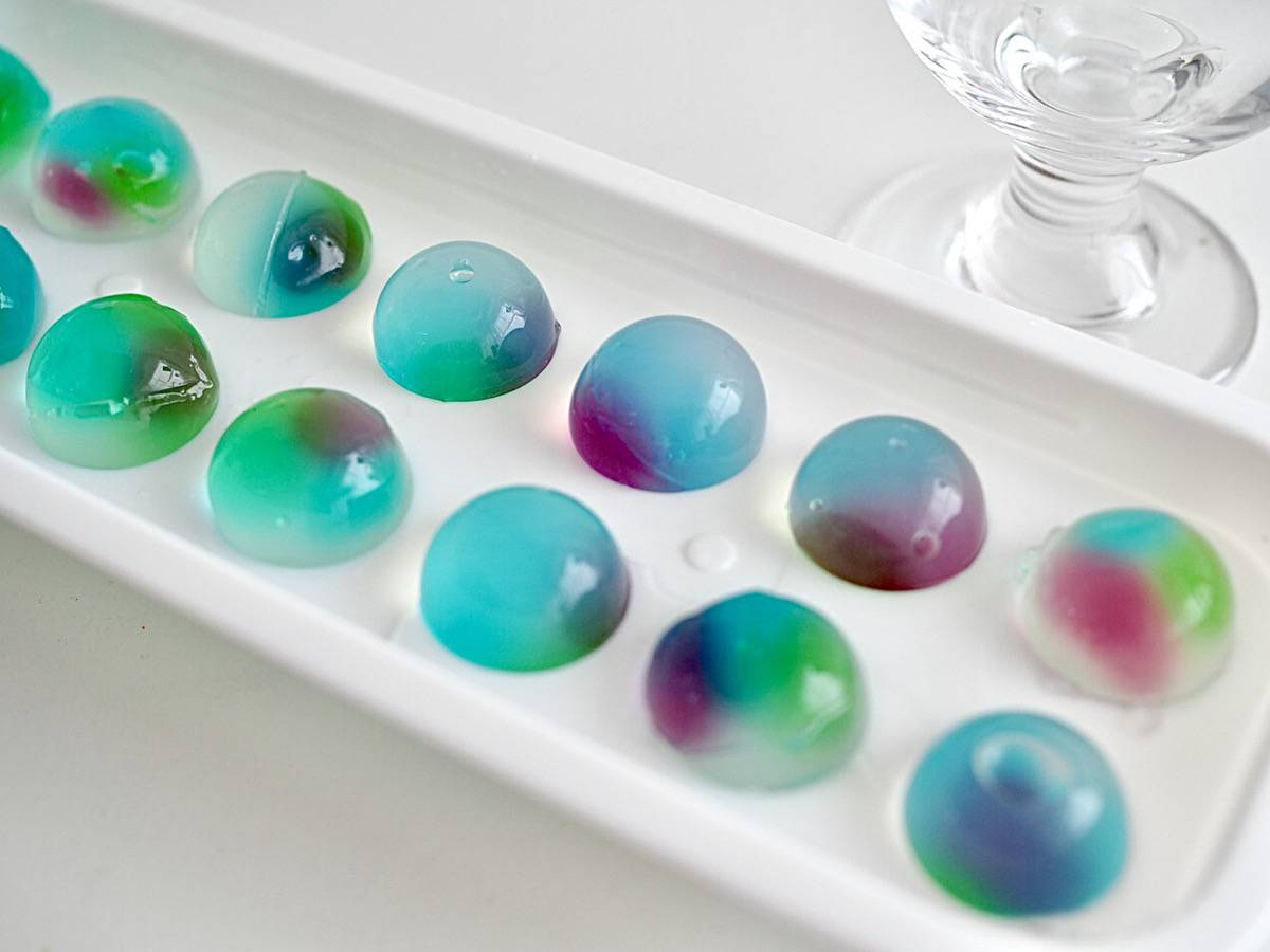 丸型の製氷皿に寒天液を少し注ぎ、カットしたゼリーを色とりどりバランスよく加えます。残りの寒天液を注ぎ、フタをしたら、冷蔵庫で2時間以上冷やし固めます。