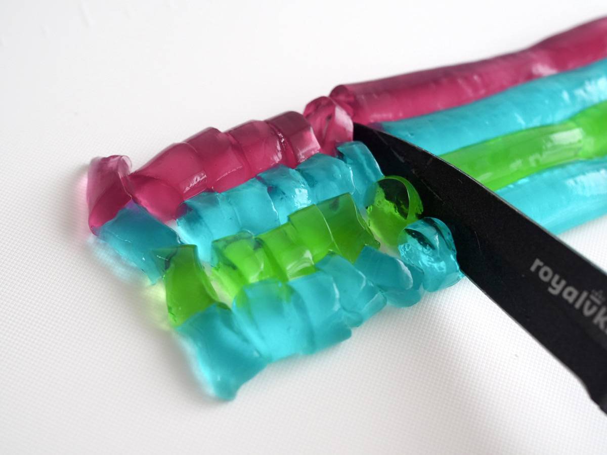 チューブタイプのスティックゼリーをまな板の上に出し、5mm幅程度に切ります。
