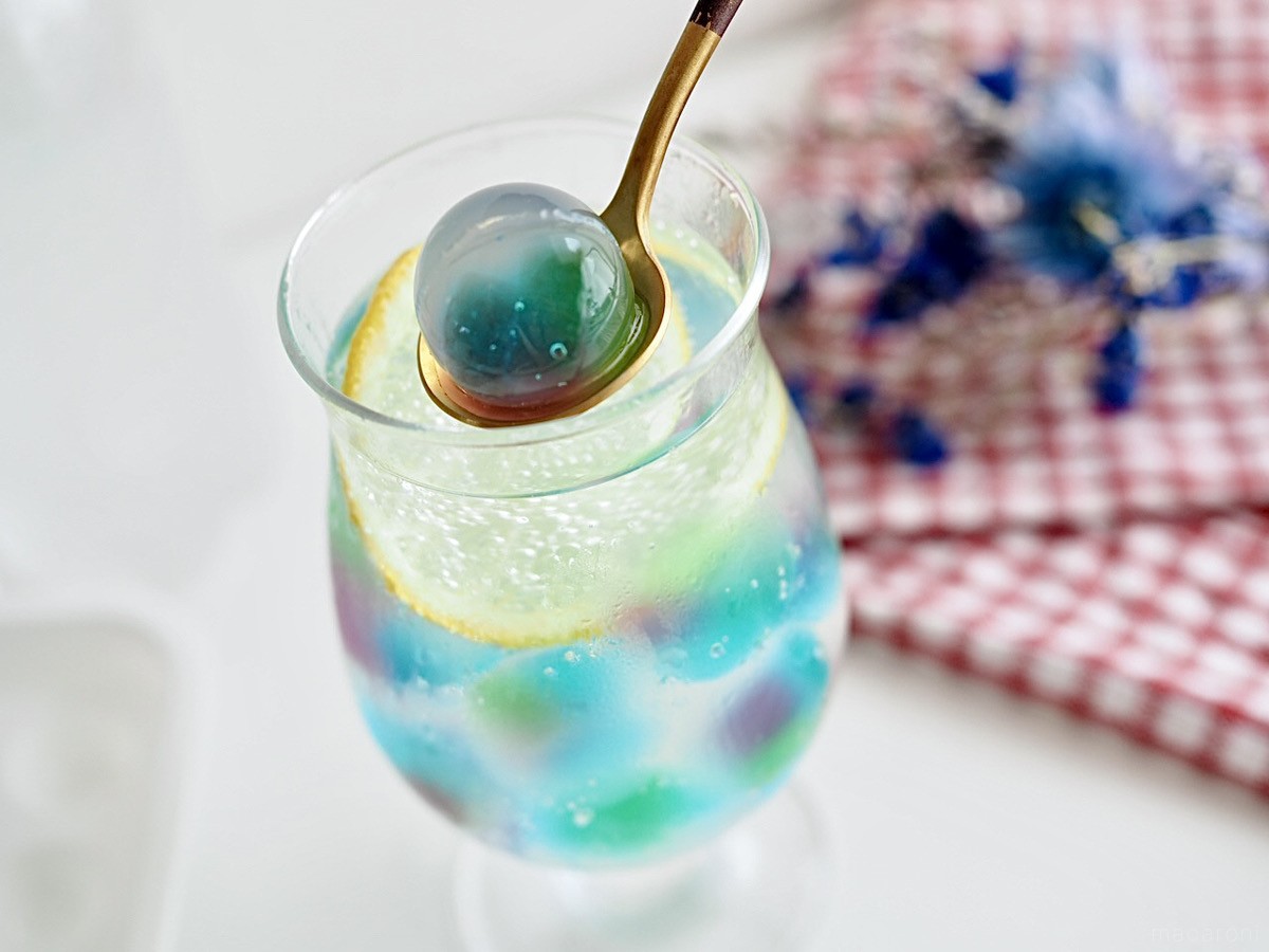 今回は寒天液に砂糖を加えませんでしたが、ゼリー自体のやさしい甘みと炭酸水のしゅわしゅわとした爽快感が重なって、どこか懐かしい味わいが広がります。特別感のある涼やかなビジュアルで、おもてなしにもぴったりですよ。