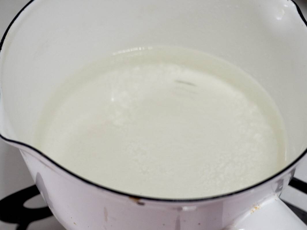 小鍋に水と粉寒天を入れ、中火で加熱します。沸騰したら弱火にし、粉寒天が溶けるまでしっかりかき混ぜます。粉寒天が溶けたら火を止め、粗熱を取ります。