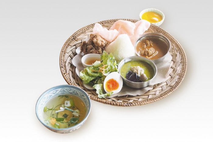 ココナッツチキンカレー(インド)、グリーンカレー(タイ)、からあげ&クルップ(インドネシア)、エベレストのように盛ったライス(ネパール)が一皿にのった、施設を象徴するメニュー。