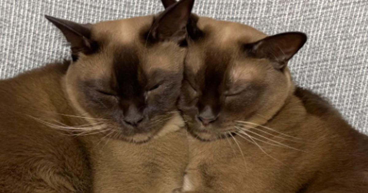 この日、飼い主さんが帰宅して最初に目にしたのは、ソファの上でぎゅっとくっつく2匹の猫ちゃんたち。顔と顔を寄せ合い、前足をしっかり絡ませて眠っている様子は、まるで合体しているかのよう。毛並みや色合いが似ているため、本当に一体化しているようにも見えます。