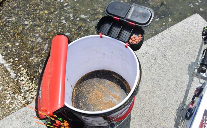 このダンゴからさしエサが出るタイミングは、ダンゴの握る回数に比例しており、握れば握るほどダンゴが固くなり出るタイミングは遅くなる。小魚ばかり釣れてしまう場合は、少し握る回数を増やし、クロダイが寄ってくるタイミングに合わせてさしエサを遅めに出してやると良い。