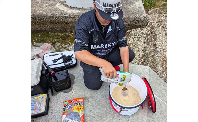 配合剤は全てマルキユー製品だ。ウキダンゴX1袋に対し、オカラだんごを計量カップで500cc、細びきさなぎ25cc、チヌスパイス25cc、活さなぎミンチ激荒4分の1袋、解凍済みアミエビ50ccに海水400ccを入れて混ぜる。ムラがないように均等に混ぜ込むことがポイントだ。目安としては、3分ほどかけて混ぜると良い。