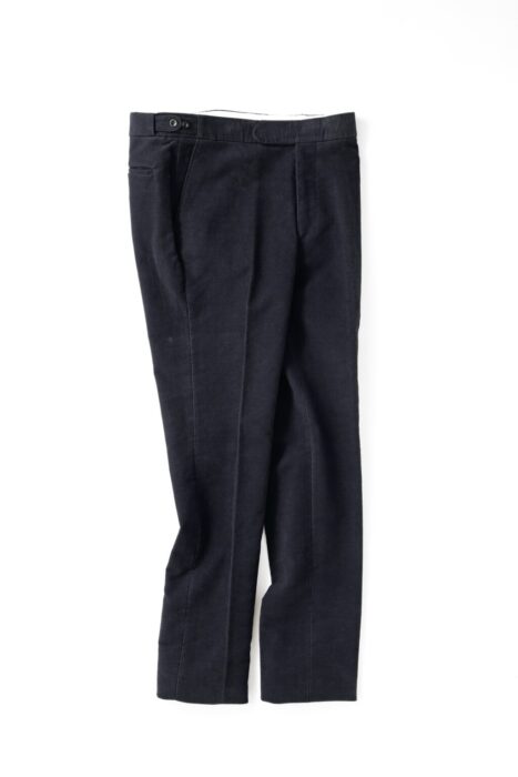 柔らかくて丈夫な、イギリスの名門ブリスベン・モス社製の14ozのヘビーウエイトモールスキンを使用したトラウザー。流行に左右されないストレートシルエットが魅力。3万9600円(真下商事TEL03-6412-7081)