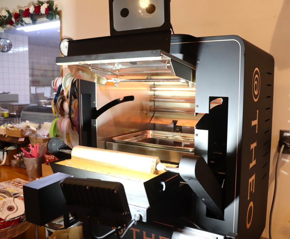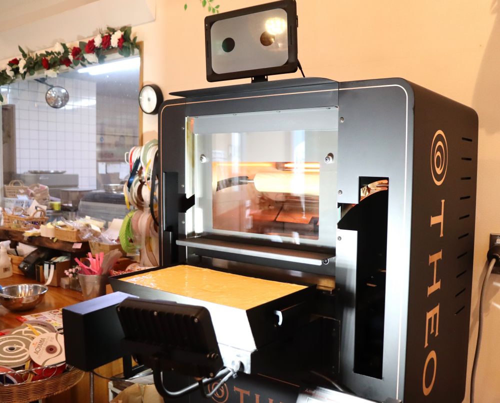 お店に入ると目を引くのが、株式会社ユーハイムが開発したバウムクーヘン専用の機械、AI職人「THEO(テオ)」。全国に20数台ほどしかない希少な機械で、AIが焼き色や焼き時間を自動で調整してくれる優れものです。