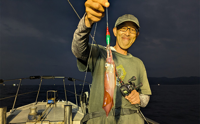暑さ厳しい真夏の釣行は、涼しい夜に快適なイカメタル&バチコンアジングが最適。今回は6人でチャーターし、ケンサキイカを狙ってナイト出船。赤緑カラーが大当たりし全員安打を達成。終盤にはバチコンで30cm超の良型アジも登場しました。