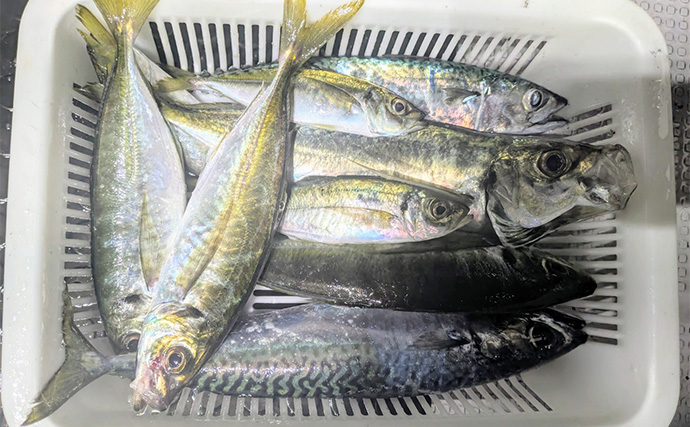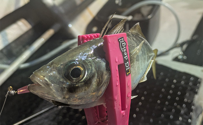 すると、やはりフォール中にサバが掛かり、暴れ回ります。引きは楽しいですが、狙いはアジです。シンカーをワンサイズ重くし、着底後1mほど上げた位置でアタリがありヒット。上がってくる途中、もうひとつの針にサバが食いつきましたが、25cmオーバーのアジが釣れました。