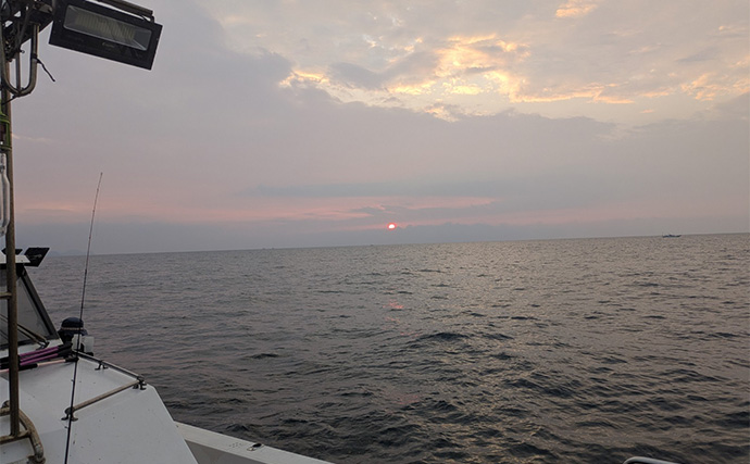 しかし魚を狙うには完全に回遊待ちの状況で、明るい時間帯には魚もイカもまったく反応がありませんでした。日没までの間は船上でゆっくりと過ごします。この時間帯にしっかり食事や水分補給を行い、時合に備えました。