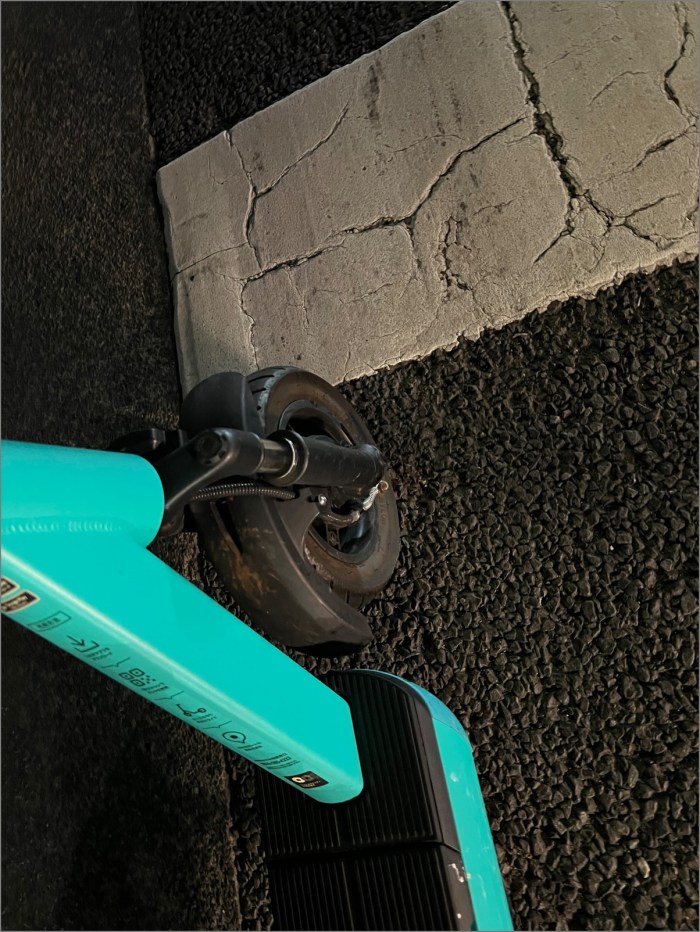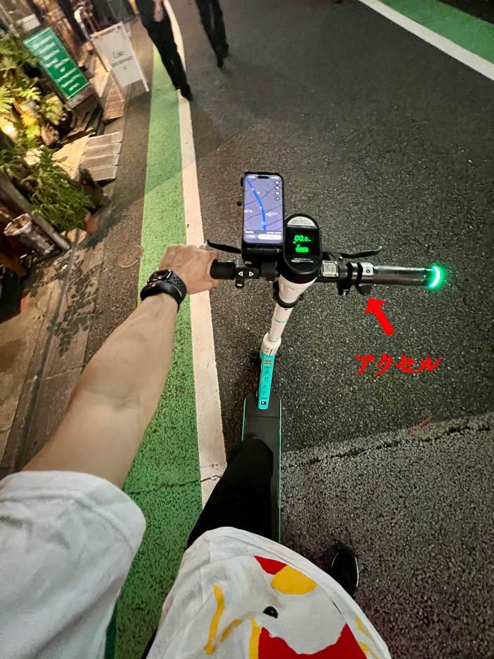 時速的には、最高20kmくらいか。体感的には、自転車と同じくらい。で、サス(サスペンション)がないので、けっこう段差でガタガタと振動がダイレクトで来る。いかにもキックボードという感じだ。
