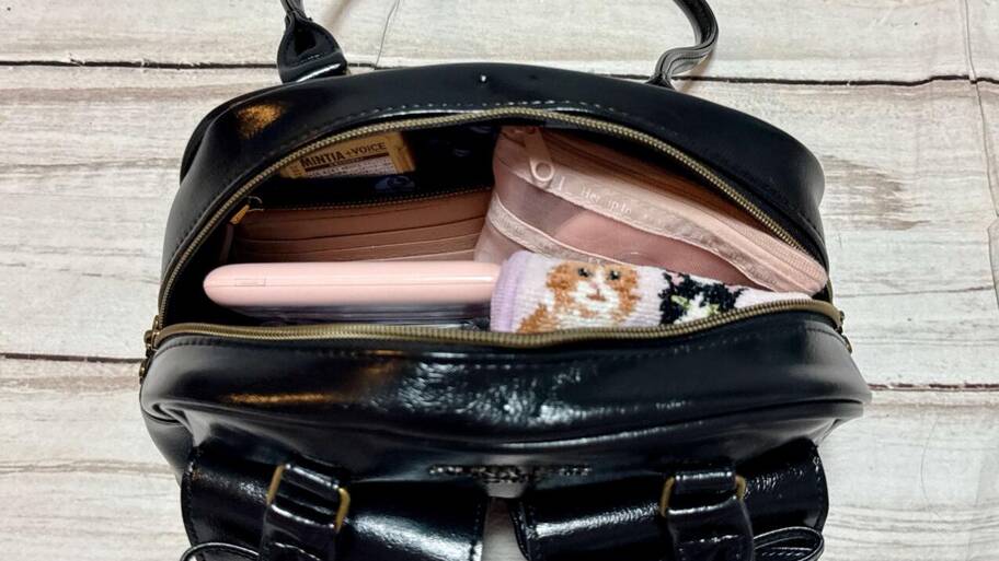 上記の荷物が問題なく入りました!ミニ財布やイヤホン、ミラーなど細々したものは、ファスナー付きポケットに入れると取り出しやすく便利♪