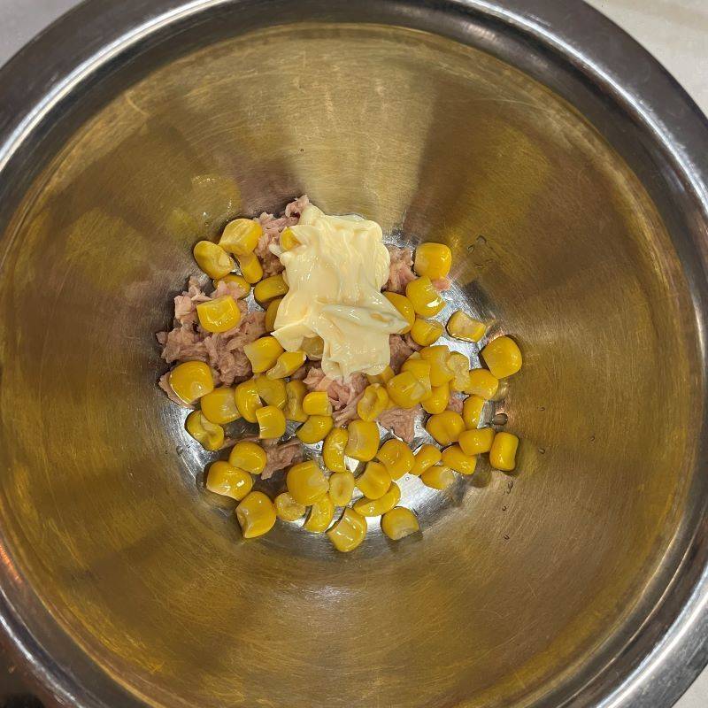 ボウルに、水気を切ったツナ缶・コーン・マヨネーズ・塩こしょうを入れ、混ぜましょう。