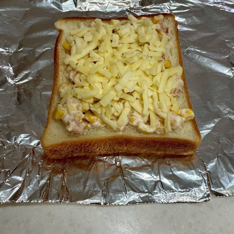「ツナマヨチーズトースト」を、1人分にアレンジして朝ごはんに作りました♡