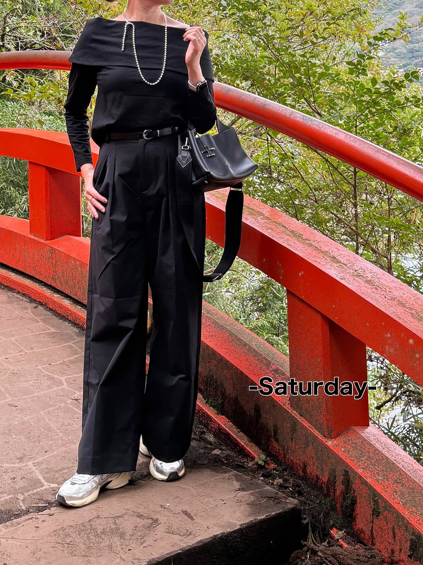 バッグやトップス、ボトムを黒で統一することで、引き締まった印象はキープしつつ、スニーカーの白がコーデに抜け感と明るさをプラス。