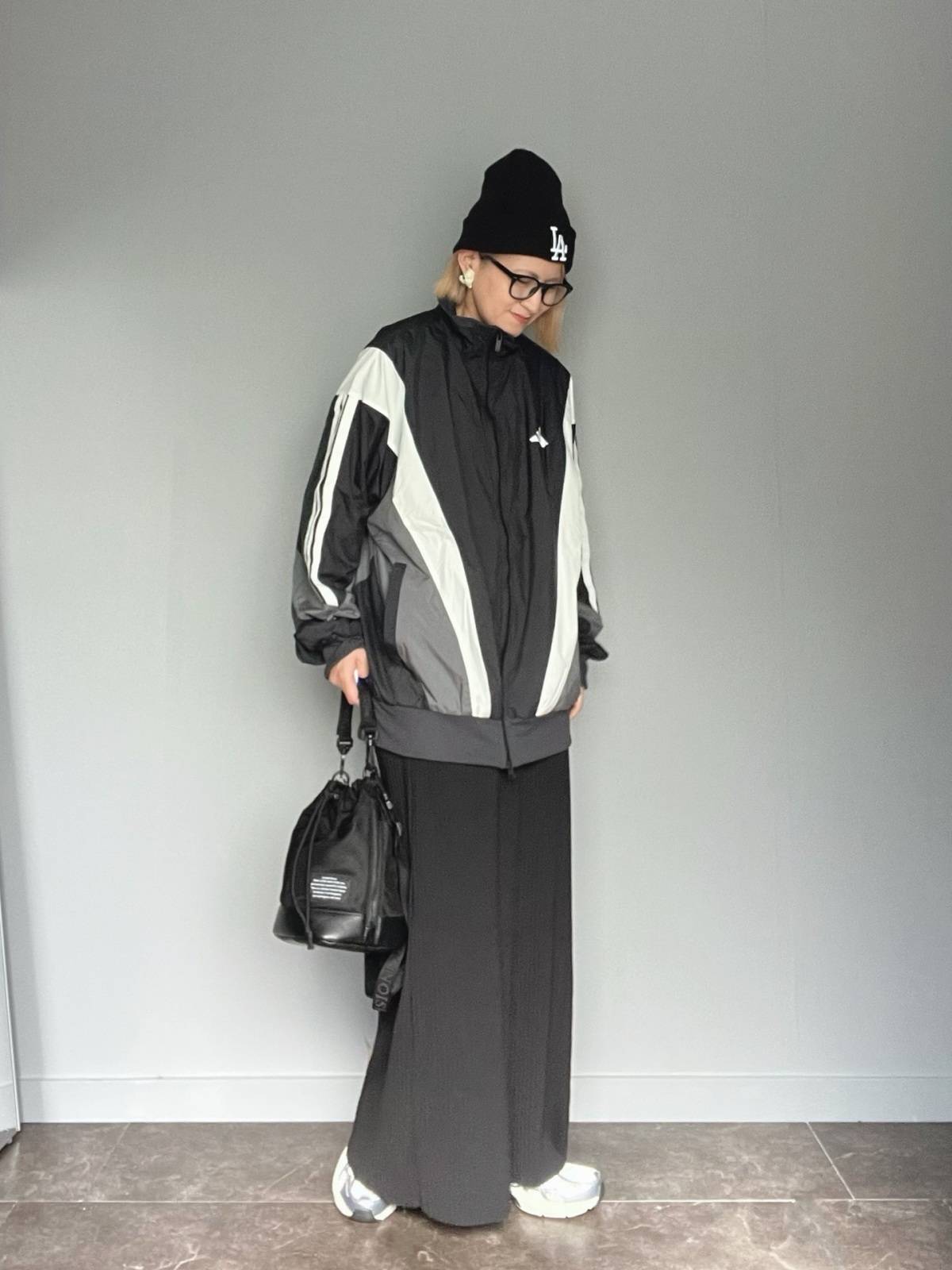ラインが入ったトラックブルゾンやビーニー、スニーカーを取り入れれば、50代の女性もマネしやすい、初冬の気候によく似合うコーデの完成です♡
