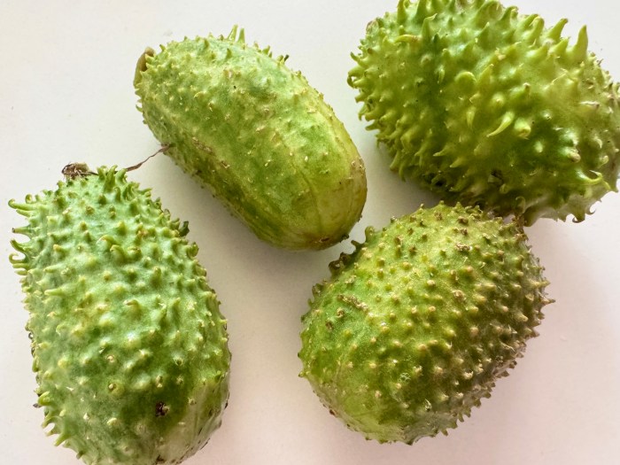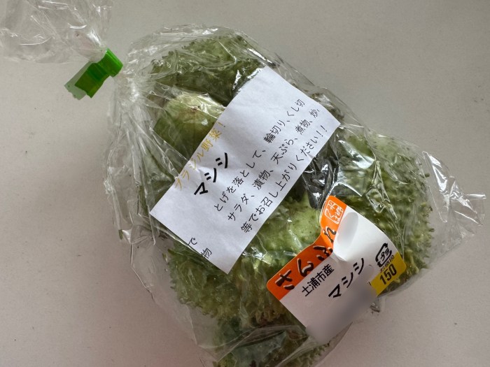 ゴーヤのようなドリアンのような、トゲトゲを有する緑色の楕円形。小さめ卵くらいのサイズが8個入り150円と激安である。マシシが安いのか、それともサンフレッシュつくば店が良心的なのだろうか?