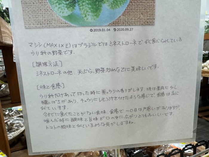 マシシの原産地はブラジルで、現地では主にミネストローネに使用されるとのこと。ミネストローネの発祥はイタリアであるが、ブラジルでも食べられているうえに、そのようなアレンジが加えられているのですね。ちっとも知りませんでした。