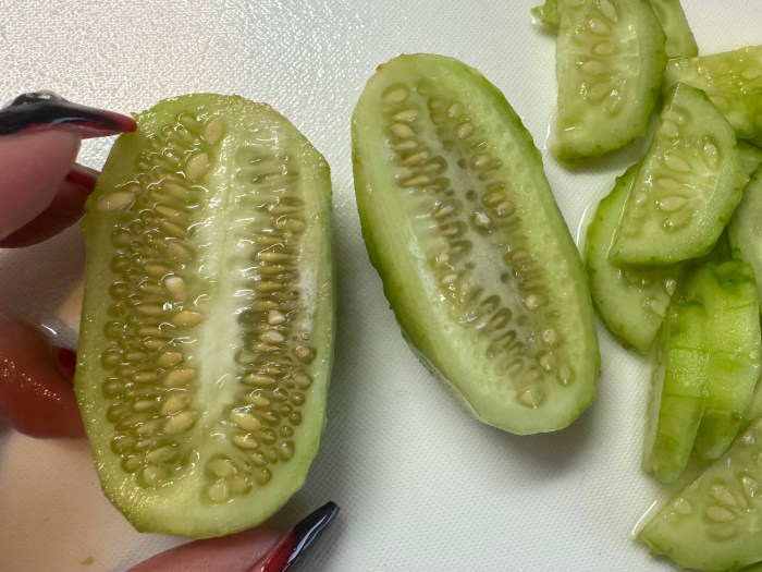 集合体恐怖症の人にはちょっとキモいかもしれないマシシであったが、半月切りにすると「普通のキュウリ」になった。なおトゲを落とした段階では竹のように強烈な青臭さを放っていたのが、スライスするにつれどんどんキュウリの匂いになっていった。