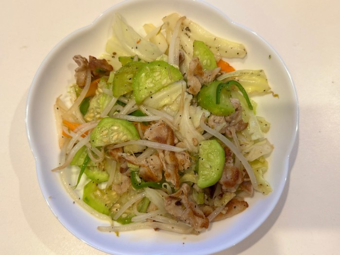 世にも珍奇な『マシシ入り野菜炒め』の完成! 見た目はとってもイイ感じである!