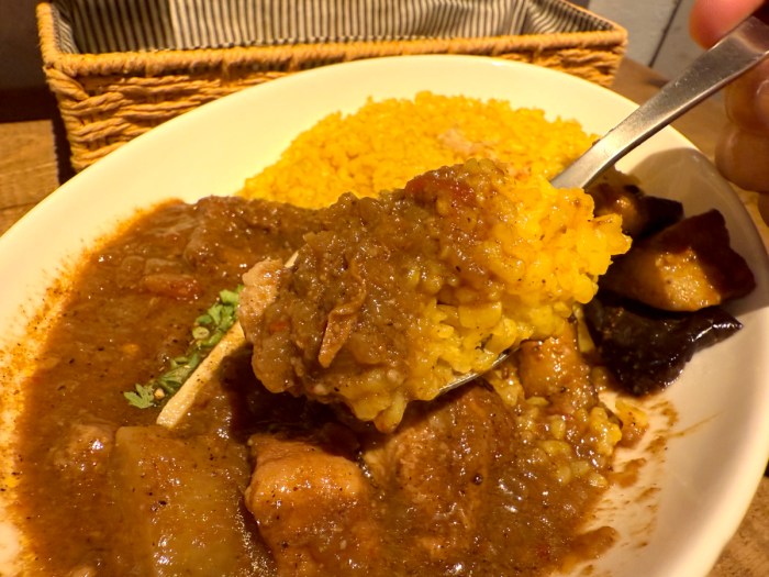 さっそく食べてみると……おっ、ウマい! ポークビンダルーの特徴である酸味はしっかり感じる一方で「酸っぱい」というほどではない。言葉にするならば「まろやかな酸味」といったところだろうか?