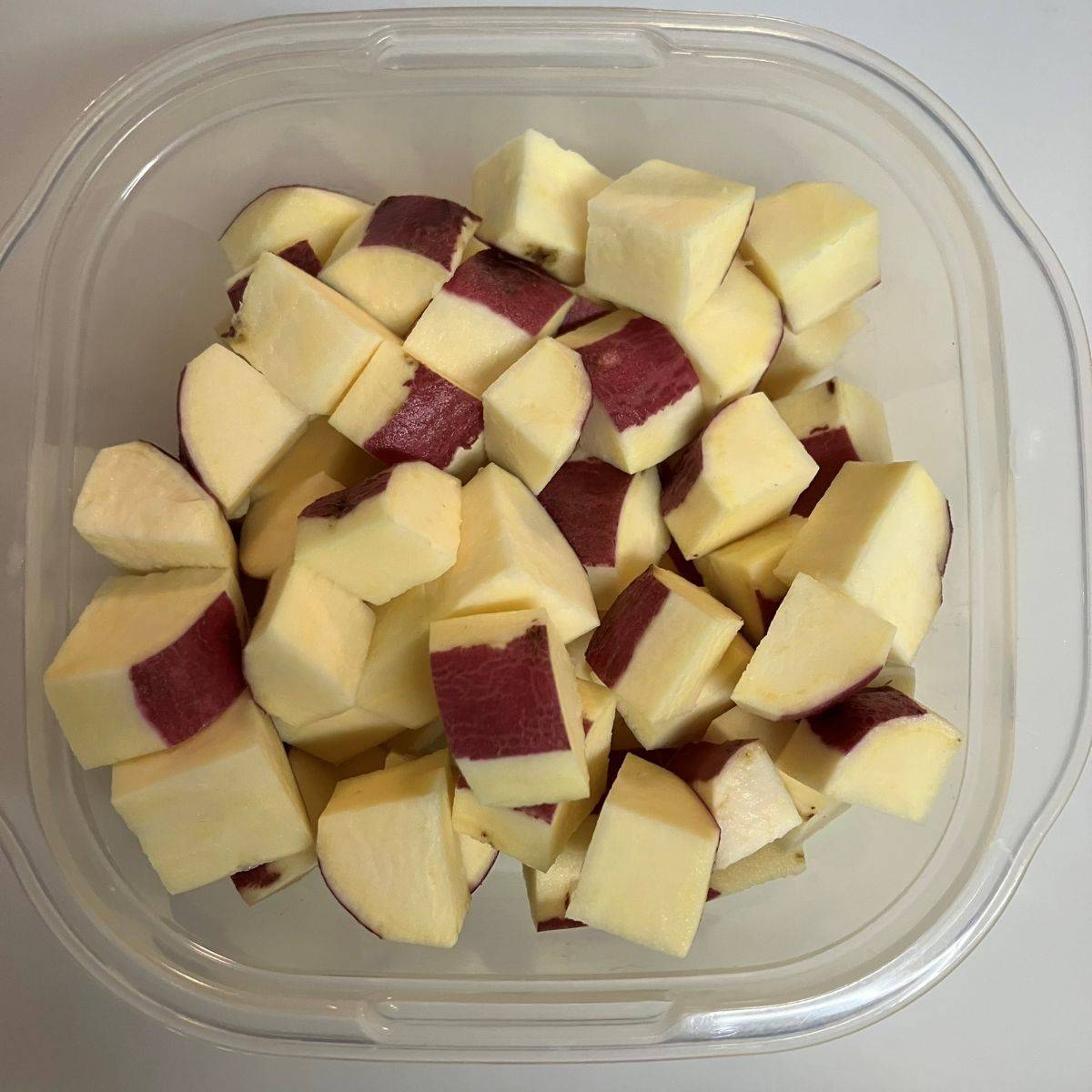 さつまいもはよく洗い、縞状に皮をむき、1cm角のいちょう切りにします。