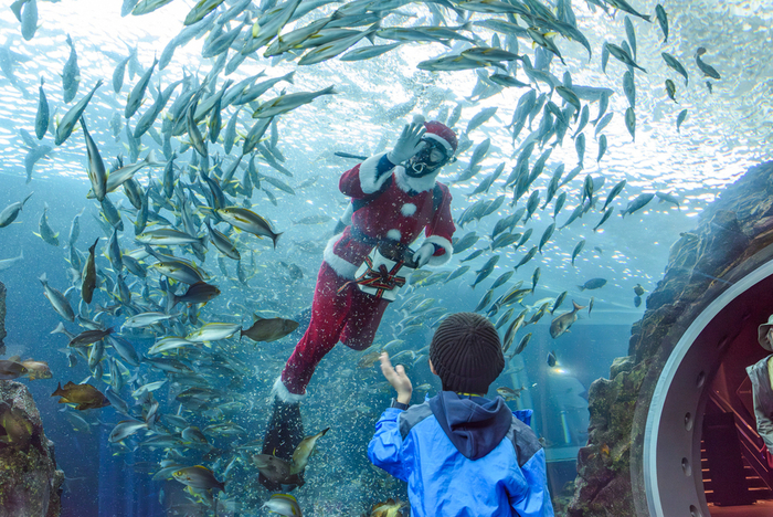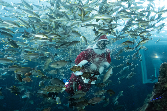 この時期恒例のイベントで、25日のクリスマス当日まで行われる。50種3万8000匹がいる大水槽にサンタダイバーが泳いで登場し、リボンを付けてプレゼントに見立てた箱から、オキアミなどの餌をまく。ダイバーの周りにはイサキやコブダイなどが群れを作り、訪れた人は迫力ある魚の動きやダイバーを撮影して楽しんでいた。