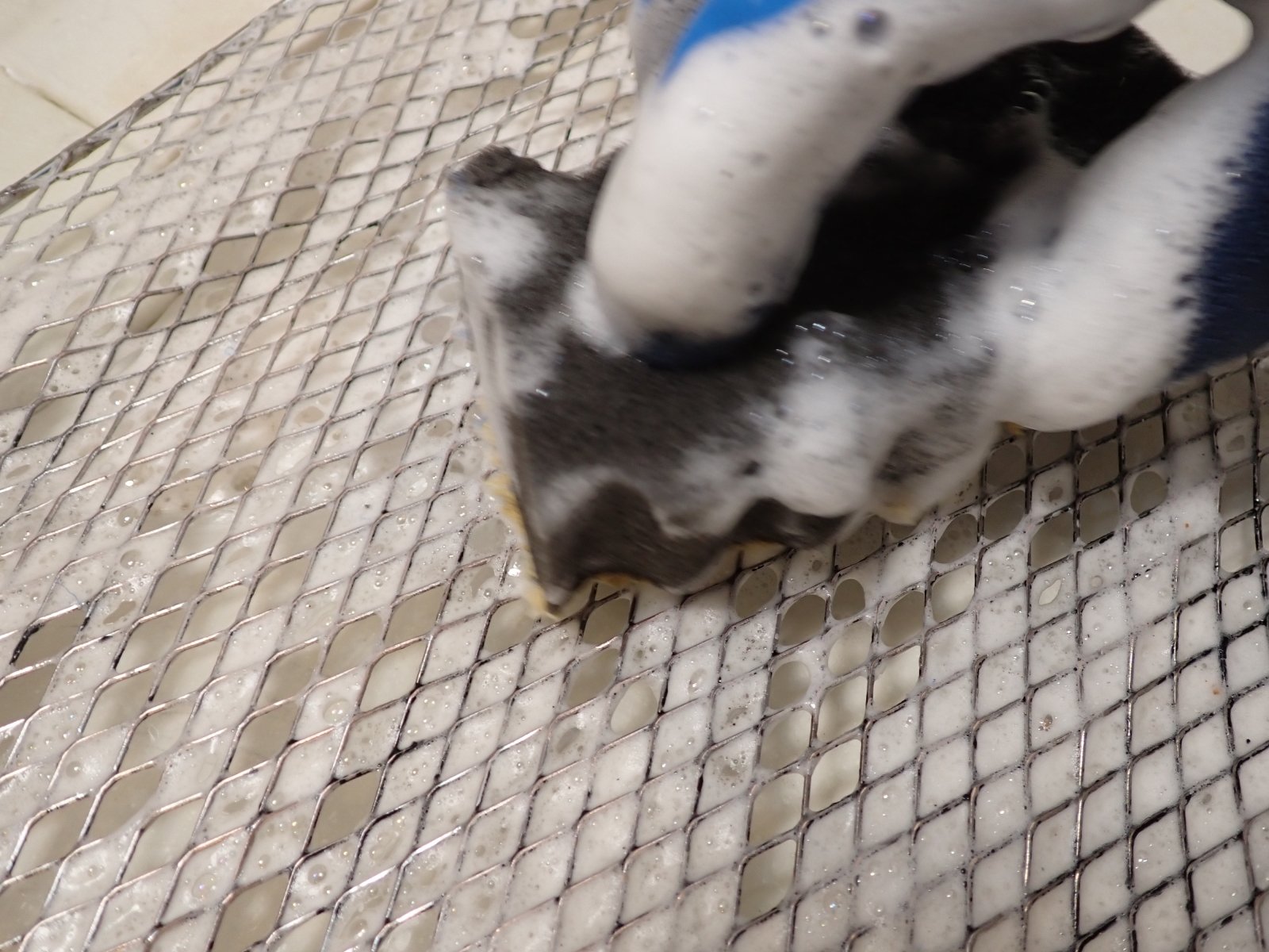 コゲがふやけたら、いよいよボンスターの出番! 円を描くようにクルクルと網をこすっていくと、コゲがスルスル落ちていきます。この快感がたまりません。力を入れすぎず、軽い力でこするのがコツです。
