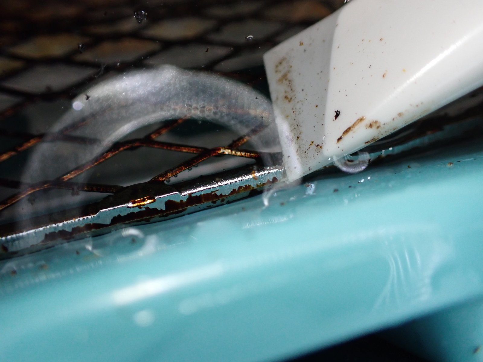 つけ置き中に試しにヘラで軽くなでると、ポロポロとコゲが落ちていきました。重曹がしっかり効いているようです。我が家の網はコゲつき具合がひどかったので、2時間ほどつけ置きしました。