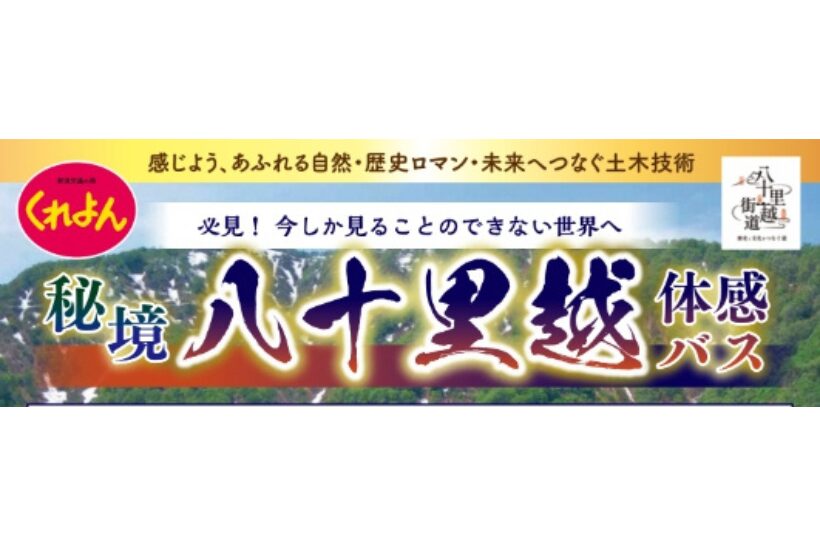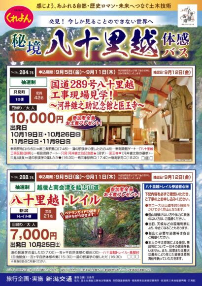 対象は中学生以上で、未成年は保護者同伴が必要。申し込みは新潟交通くれよん万代で受け付け、秘境八十里越体感バスは電話とメール、八十里越トレイルは電話のみで対応する。申込期限は9月11日まで。応募多数の場合は抽選となる。