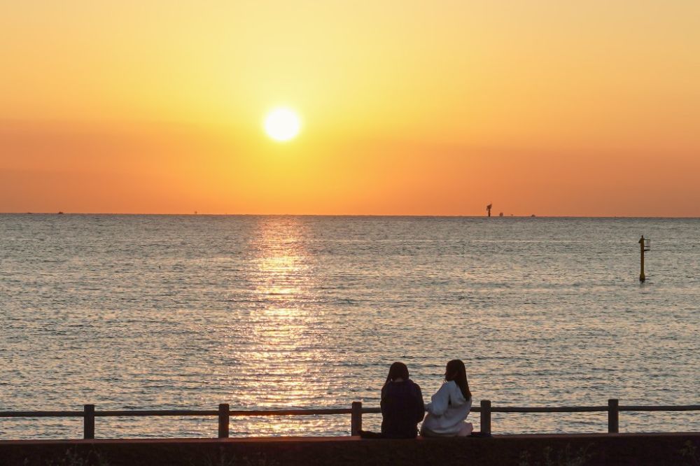 扇ケ浜に沈む夕陽と心地よい潮風に包まれながら、好きなグルメを片手に、ゆったりとビーチ散歩。冬の海ならではの特別な時間が流れます。