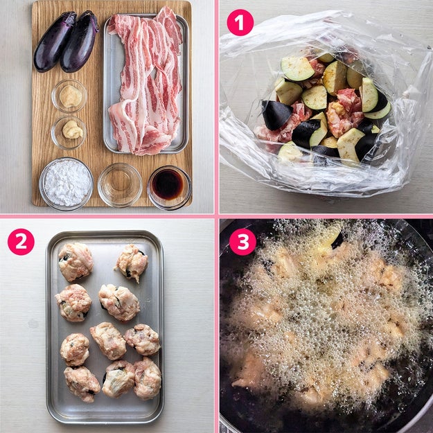 ② ①をボウルに移し、片栗粉を加えて全体をよく混ぜる。なすに豚バラ薄切り肉を巻きつけるようにして、少し強めに握って形を整える。残りも同様に作る。