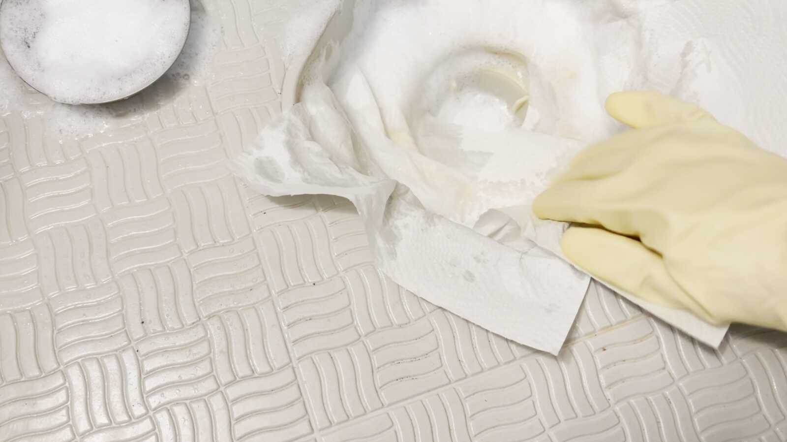 お風呂掃除で使うカビ取り剤の泡スプレータイプ(塩素系)は、液だれして汚れにとどまらなければ、効果を十分に発揮できません。そこで効果的とされるのが、キッチンペーパーで泡をしっかり密着させる方法。泡が長くとどまり、カビ汚れにじっくりアプローチできます。