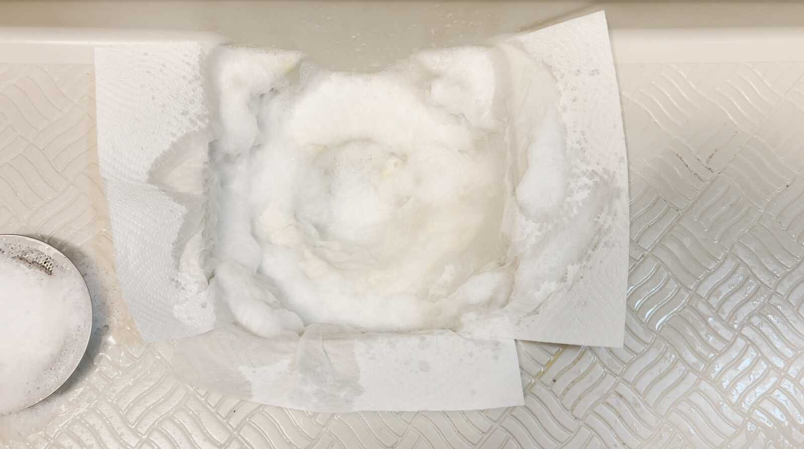 上からキッチンペーパーを貼り付け、さらに軽くスプレーして洗剤をしっかり行き渡らせます。
