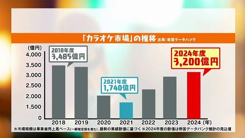 帝国データバンクによると、カラオケ市場はコロナ禍で打撃を受けましたが、いまやV字回復を遂げ、2024年度はコロナ禍前の水準3200億円に達する見通しです。