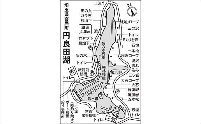 埼玉県大里郡寄居町と児玉郡美里町を跨る円良田湖。ヘラ釣り場としては半世紀以上の歴史があり、昭和31年の湖の完成からほぼ毎年のように放流がおこなわれ魚影は抜群。標高156mとけっして高くはないが、鐘撞堂山と大槻峠の南陵に囲まれた谷間にあり、景観もよくてハイキングコースとしても人気だ。釣り方はボート・桟橋・陸釣りが可能で、今回は陸釣りを中心に紹介する。