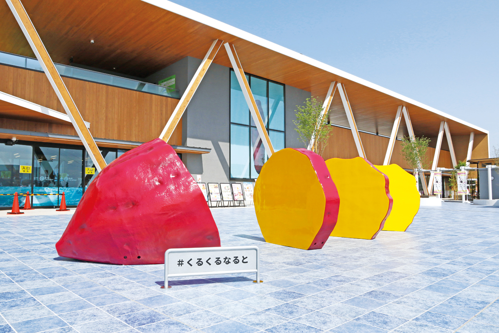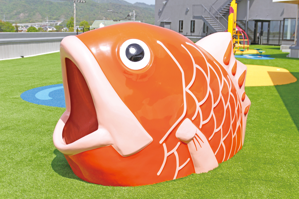 屋上広場にも鯛やレンコンなどのユニークなオブジェが。屋上の人工芝生エリアでは、スリル満点のジップラインを体験!気軽に挑戦してみて。予約は前日までにウェブサイトにて。