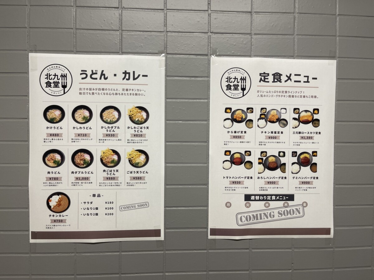 メニューは、から揚げや豚の生姜焼き、チキン南蛮やハンバーグなどの定食メニュー、かけうどんや肉ごぼう天うどん、チキンカレーなどのうどん・カレーメニューなどがあります。
