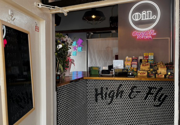 「OneOil小倉店」があるのは、昔ながらのレトロな建物。街のネオンと交わって、フォトジェニックな空間を創出しています。