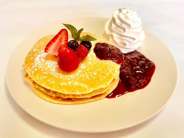 「たっぷりベリーのパンケーキ」は、カフェ限定のスイーツメニュー。いちごやクランベリー、ブルーベリーなど果肉たっぷりのソースがパンケーキとよく合います。