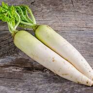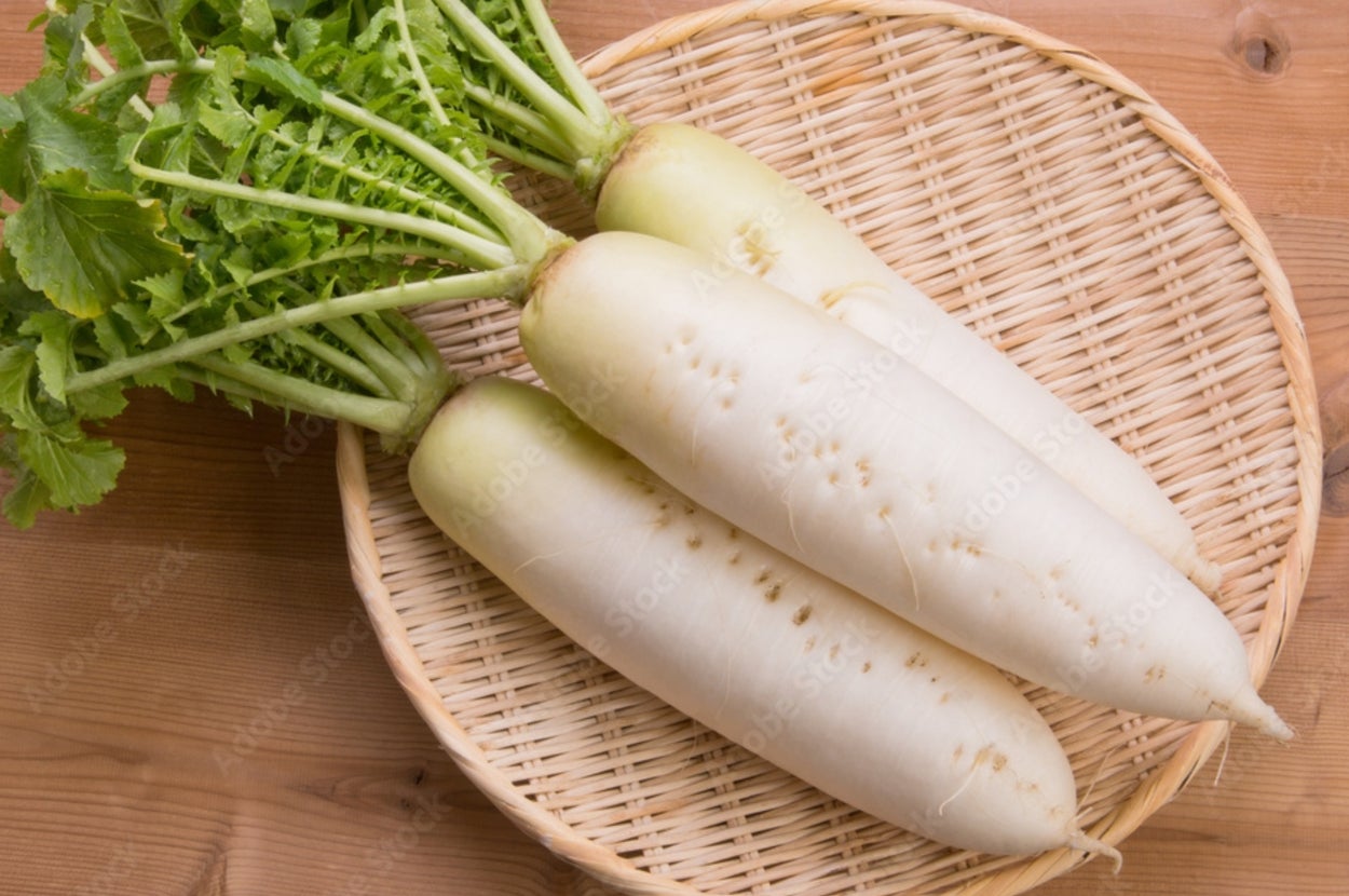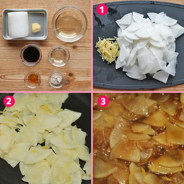 ① 大根は薄くいちょう切りにする。しょうがは千切りにする。